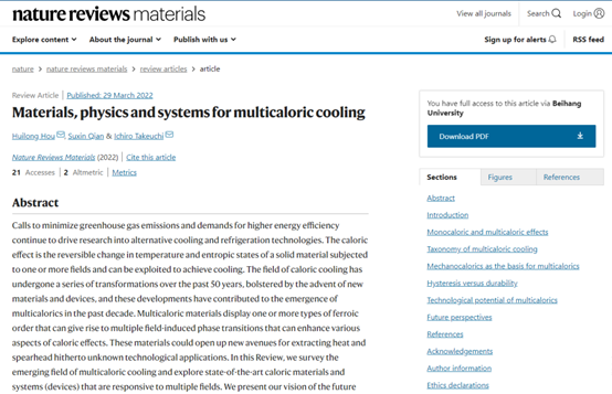 2022年3月29日,《Nature Reviews Materials》期刊报道了北京亚洲成人在线一二三四五六区侯慧龙(Huilong HOU)副教授在固态相变制冷领域取得的新进展。该期刊的影响因子为IF=66.308,在全球物质类(材料、化学、物理、工程、机械等)研究期刊的影响因子排名中,排名第一。该项工作是北航中法合作办学科研团队在基础研究方面取得的新突破!