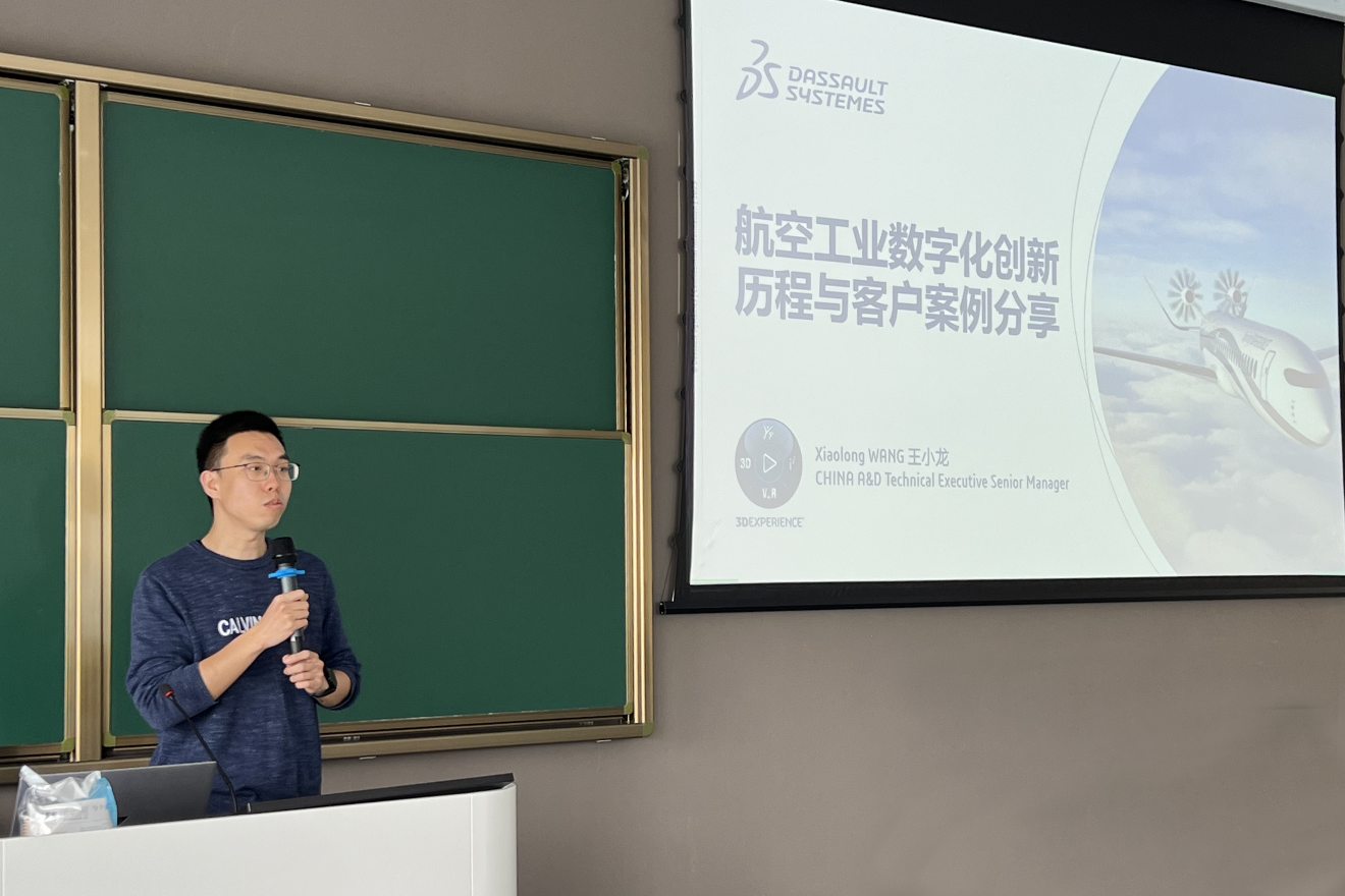 讲座环节,王小龙经理为师生作了题为《航空工业数字化创新发展历程与客户案例分享》的报告。王小龙经理系统介绍了达索系统的发展历程、民航飞机数字化设计与虚拟适航技术,并通过实际案例向大家分享了空客、商飞等大型航空公司在数字化设计方面的成功实践。分享结束后,在场师生就软件的新版本特点、人工智能的结合应用进行了深入交流。