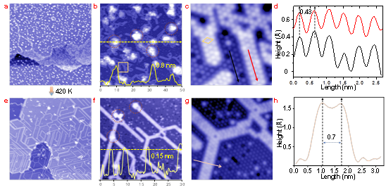 为解决这一问题,周苗教授、牛天超副教授与李晖教授合作,选择β相铋烯作为衬底,黑磷作为前驱体,在表面沉积并退火后,P与Bi结合形成了三原子宽度的BiP纳米带。实验结果表明,当衬底温度低于400 K,衬底表面由短的纳米带及随机分布的团簇组成(图1);当衬底温度达到420 K,BiP纳米带趋向均一化,长度增加且仅受限于衬底平台尺寸。原子分辨STM图显示纳米带仅有三个原子宽度(~0.7 nm),高度为0.15 nm,晶格周期(0.43 nm)与衬底一致(I型纳米带),且纳米带的生长方向与衬底晶格的高对称方向对齐,表现出良好的外延生长规律。