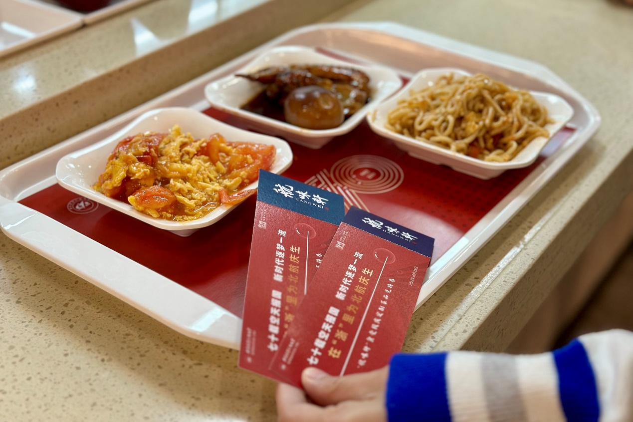 10月25日中午,“航味轩”食堂推出校庆特供菜品,凭限定餐券可免费兑换一份。结合杭州秋日特色和“70”主题,四道“HANG味”:“70”定制(鸡翅+卤蛋)、桂花糖藕、糖炒栗子、茄汁拌川新鲜上架。