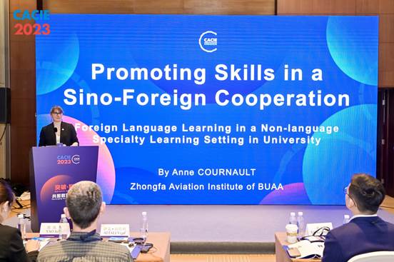 28日上午,安灿(Anne Cournault)参加了本届年会数字时代的中外合作办学与语言学习研讨会,并以“中外合作办学院校学生的提升技能:高校非语言类专业环境中的外语学习”为主题进行了介绍,具体分析了中外合办工程师院校学生的语言学习路径,以及语言学习如何助力学生培养跨文化交流能力、问题分析思维、创新创造能动性等方面素质。