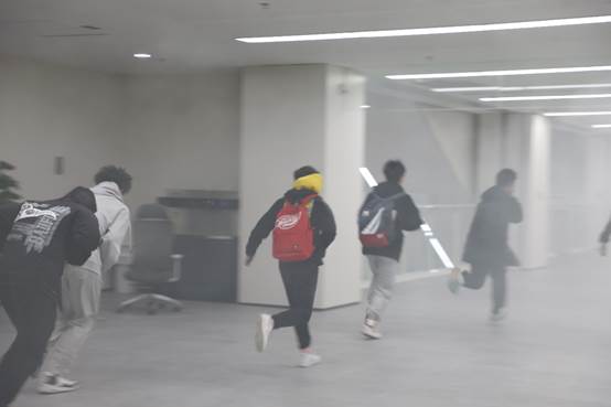讲座结束后,保安员点燃烟饼,随即消防警报响起,消防广播播报火灾情势和疏散指令,电梯迫降首层,疏散楼梯间应急照明启动,所有人立即进入消防演练状态。在接到疏散指令后,同学们迅速反应,纷纷离开教室。他们沉着冷静,听从指挥,紧密配合,按照指示牌和引导人员的指引,快速有序地从教学一号楼撤离到户外空地,整场疏散演练历时15分钟。