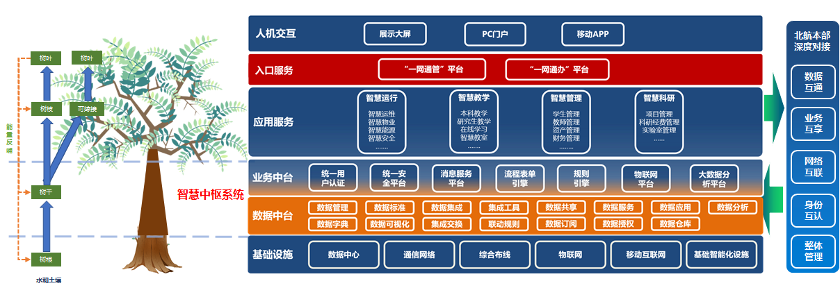 北航杭州国际校园建设了以数据中台和业务中台为核心的智慧中枢系统,串联底层硬件和上层应用软件,为应用软件的接入和使用提供了统一标准,保证了软件之间的数据、用户认证、日志、资源等互通,带来便捷强大的业务及应用部署能力,高效赋能学校运行及管理。