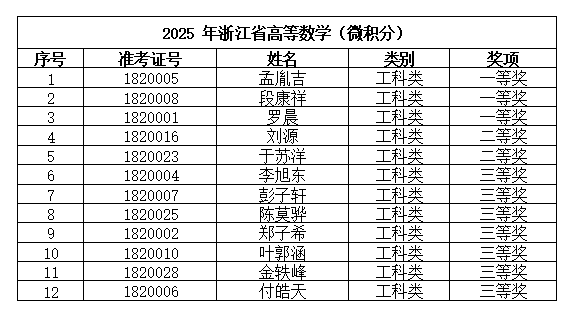 5月24日,2025年浙江省大学生高等数学(微积分)竞赛在北航杭州国际校园设立考点并顺利开考。我院共有32名本科生报名参赛,经过激烈角逐,最终3名同学荣获工科类一等奖,2名同学荣获工科类二等奖,7名同学荣获工科类三等奖。
